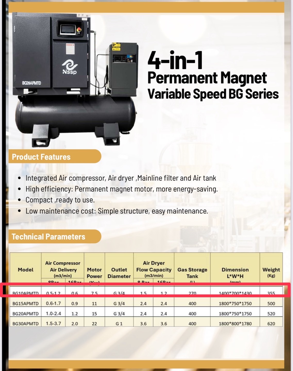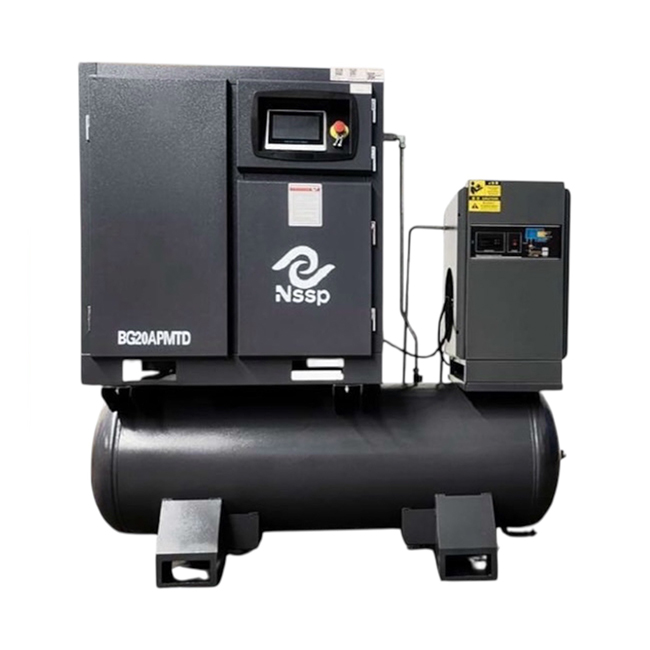 เป็นปั๊มลมสกรูที่เหมาะสำหรับโรงงานขนาดเล็กถึงขนาดกลาง ตัวเครื่องติดตั้งบนถังลมในตัว ช่วยประหยัดพื้นที่ ไม่ต้องเดินระบบซับซ้อน พร้อม Air Dryer ลดความชื้นในลมอัด เหมาะกับงานที่ต้องการลมสะอาด เช่น งาน CNC งานพ่นสี และไลน์ผลิตทั่วไป
